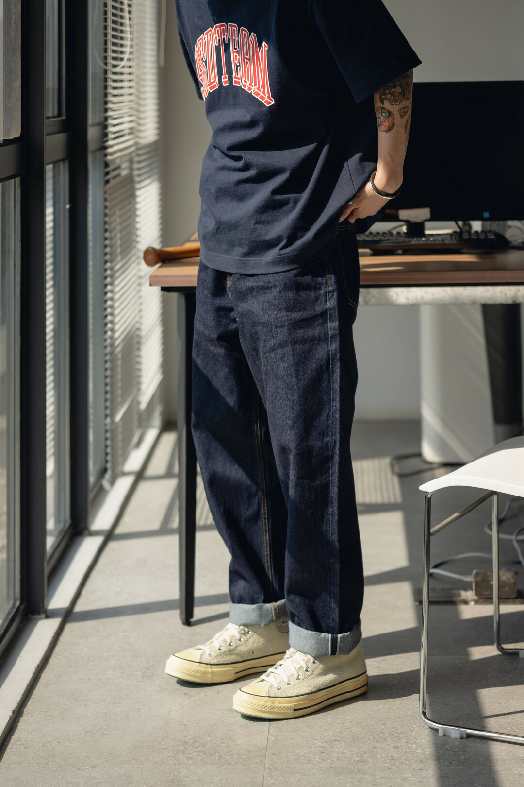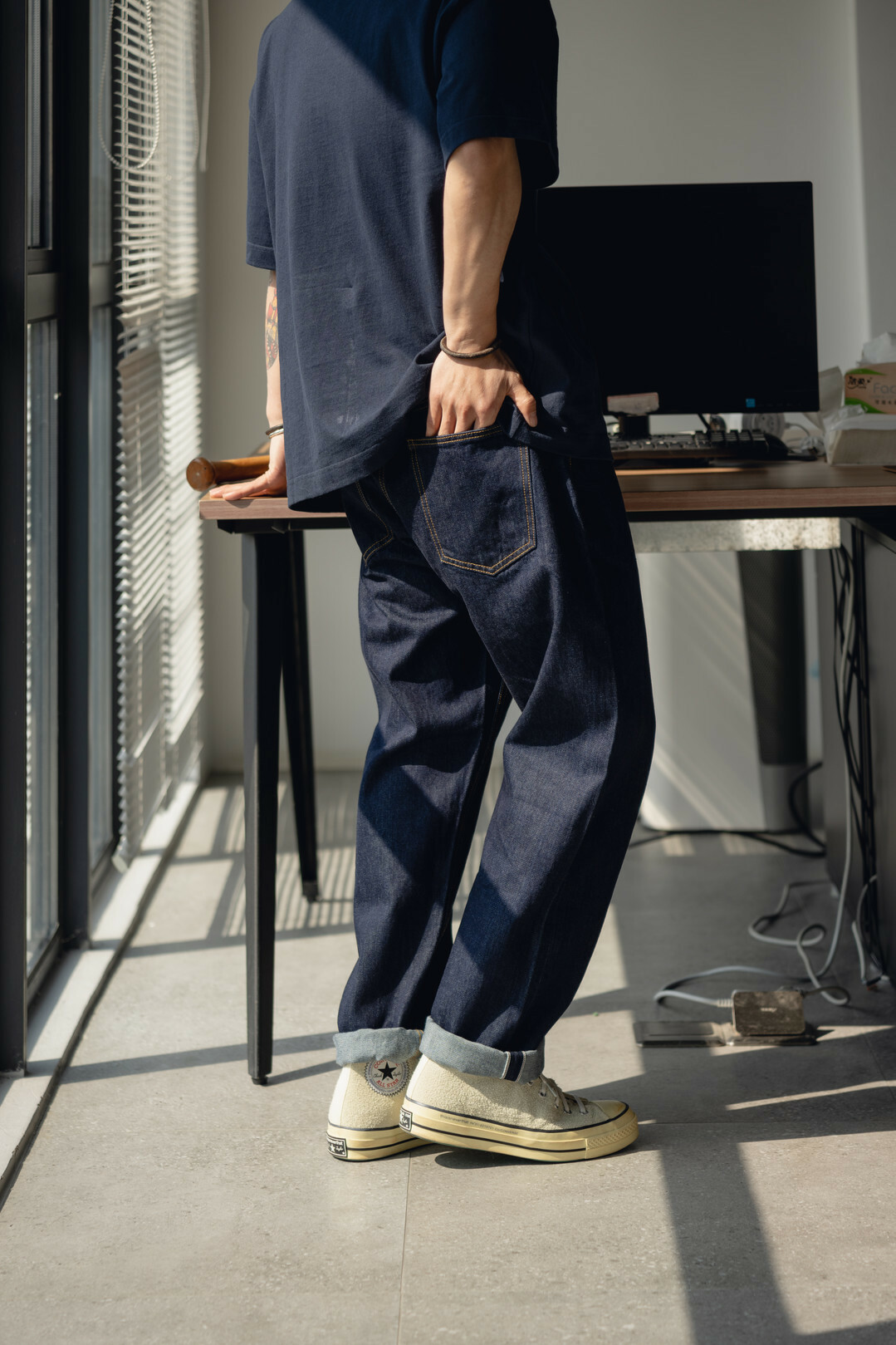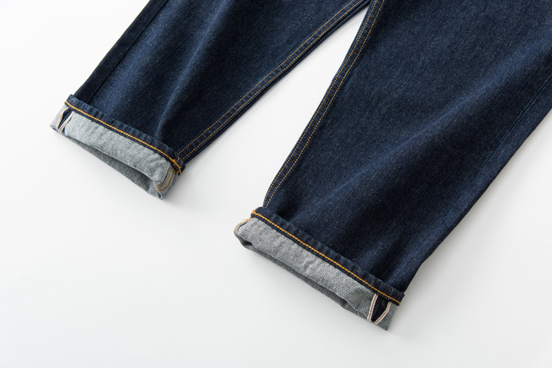 此款採用赤耳丹寧,屬於牛仔褲的一種古老而經典的車邊方式,基礎直筒的版型搭配靛藍牛仔配色,整體非常百搭好看。
