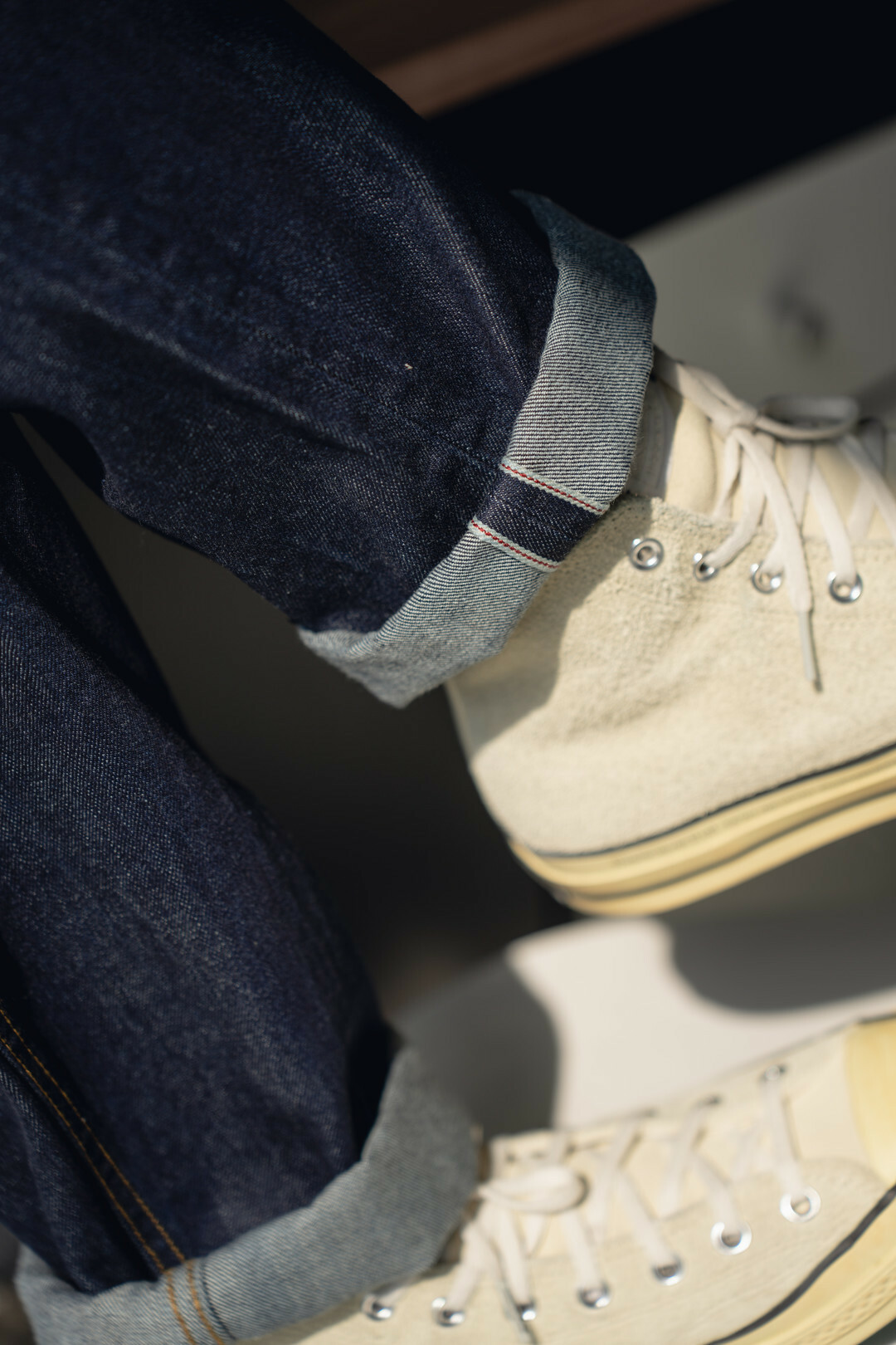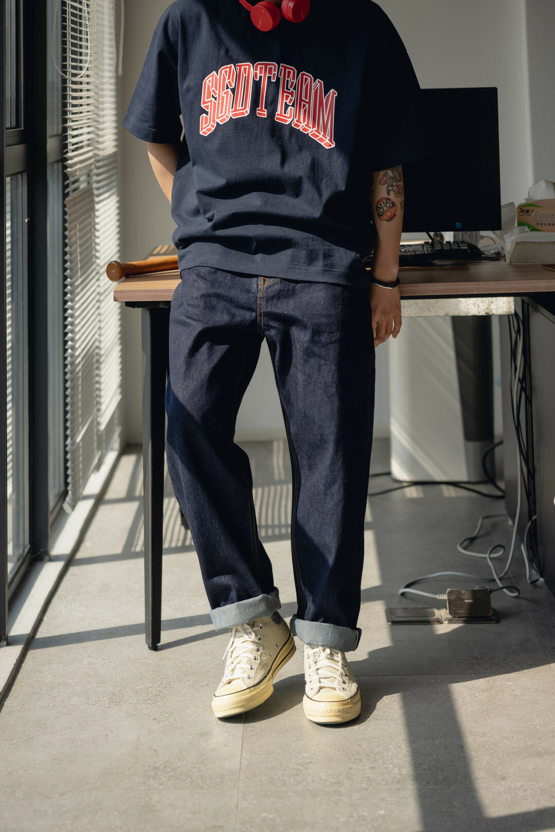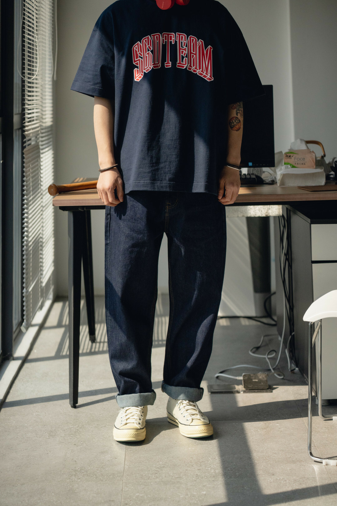 此款採用赤耳丹寧,屬於牛仔褲的一種古老而經典的車邊方式,基礎直筒的版型搭配靛藍牛仔配色,整體非常百搭好看。