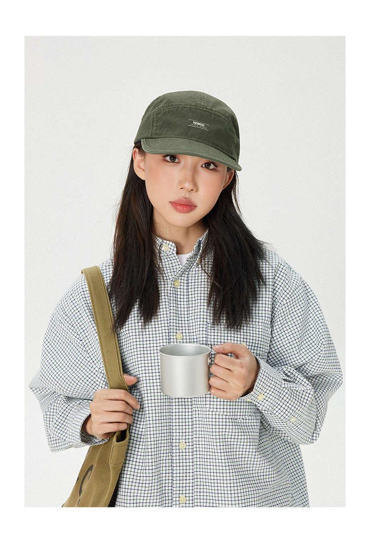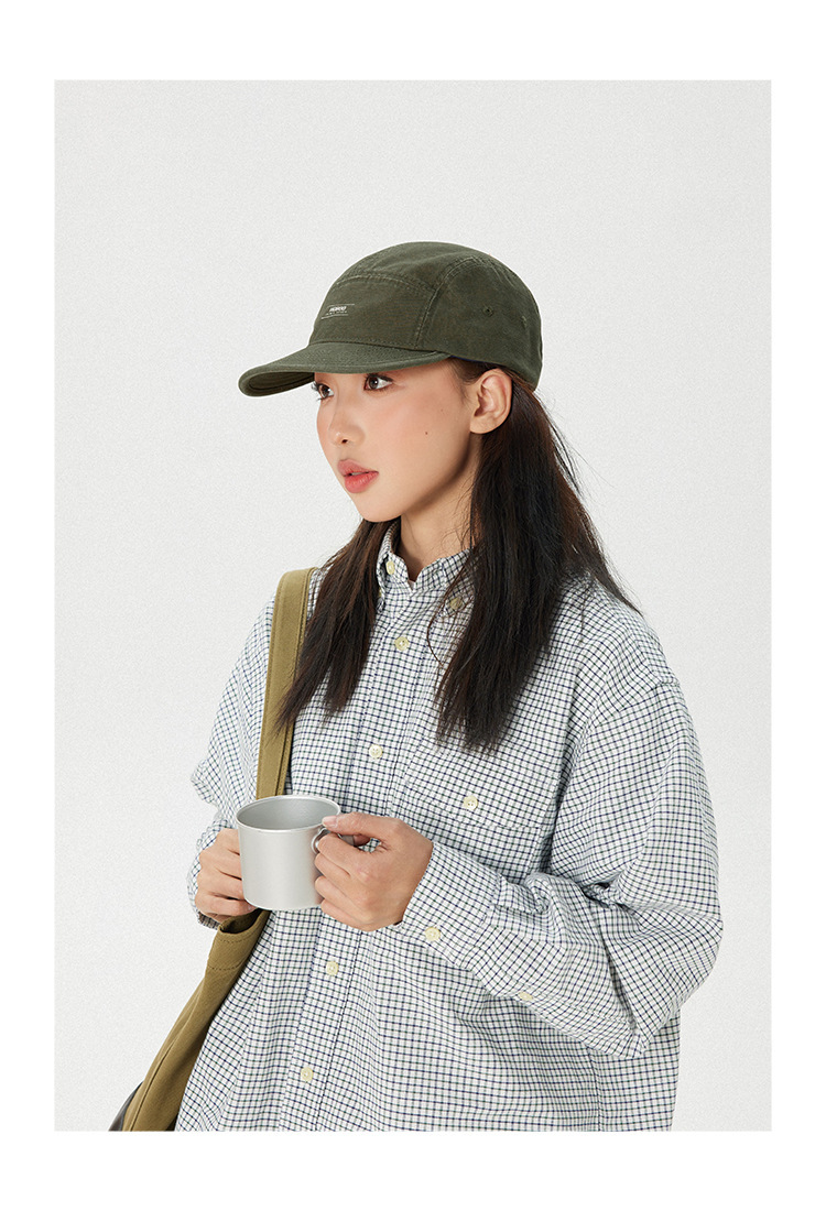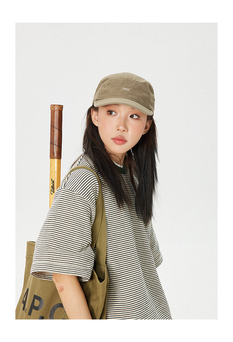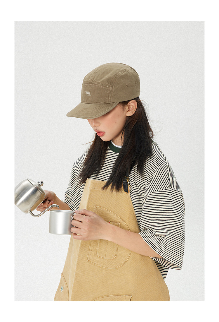 2025春夏款,此款採用棉質面料,搭配五分割帽型及質感英文字母造型設計,頭圍可調節,男女皆可穿戴。