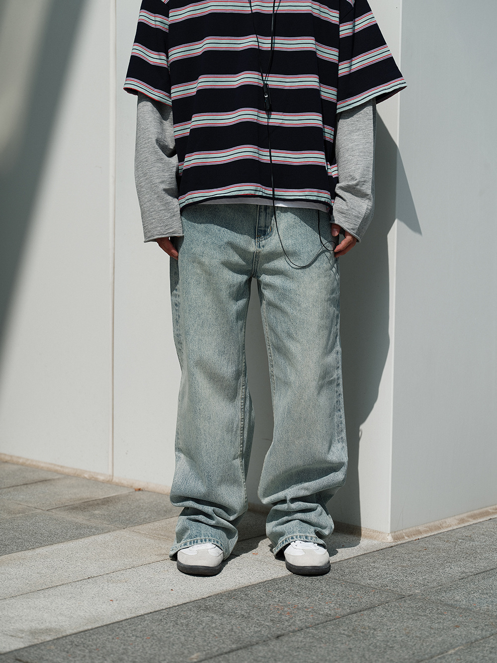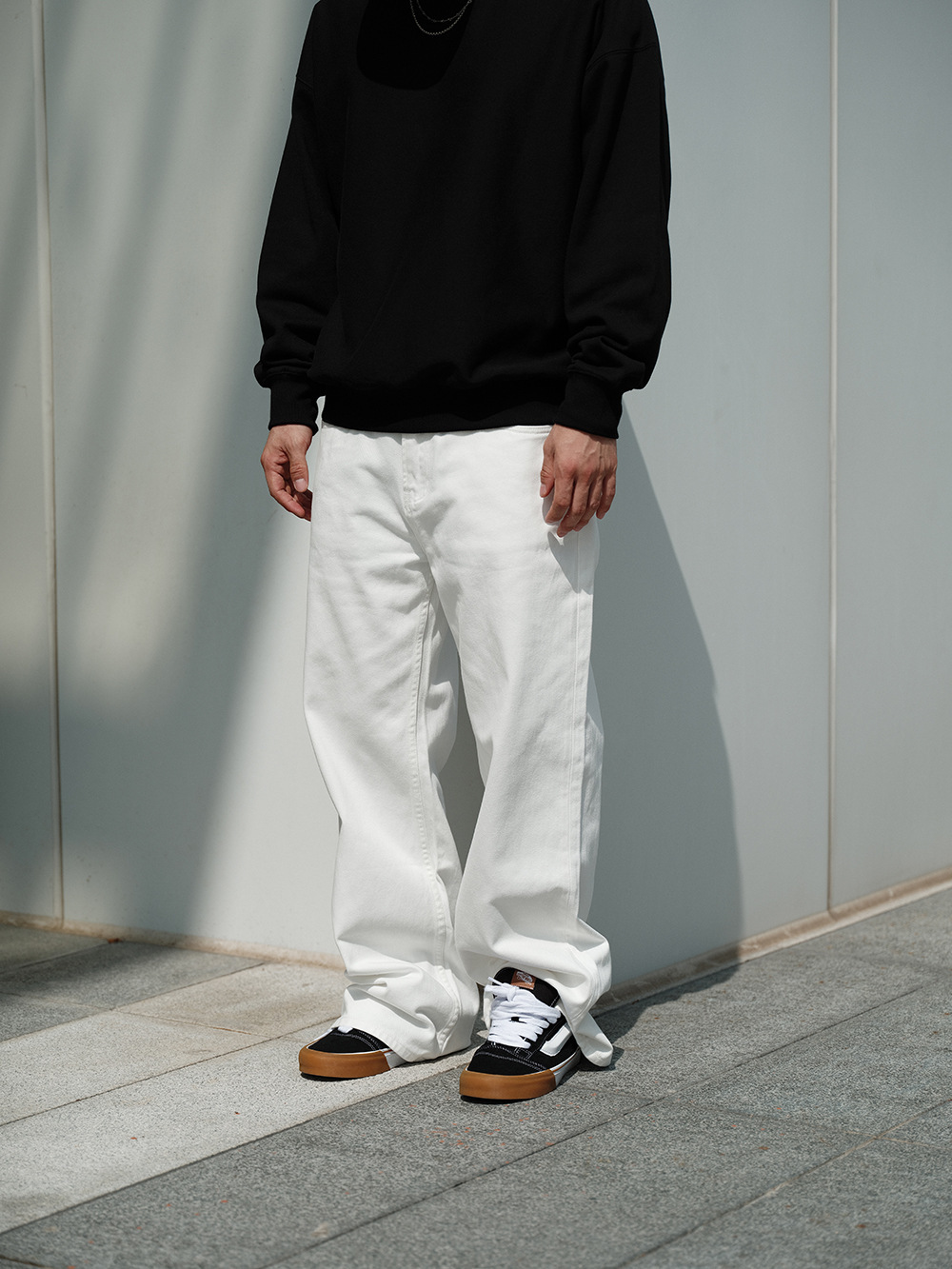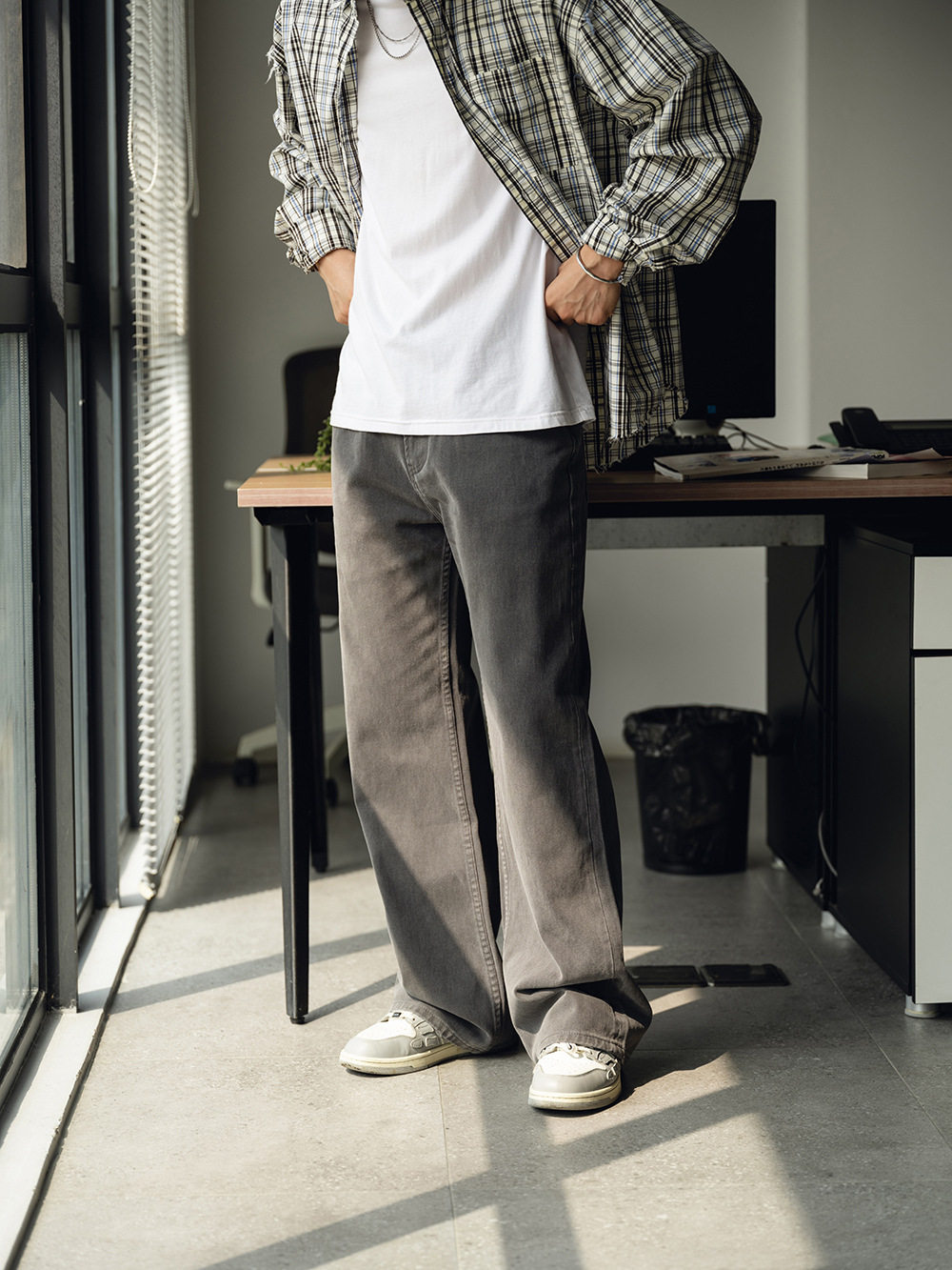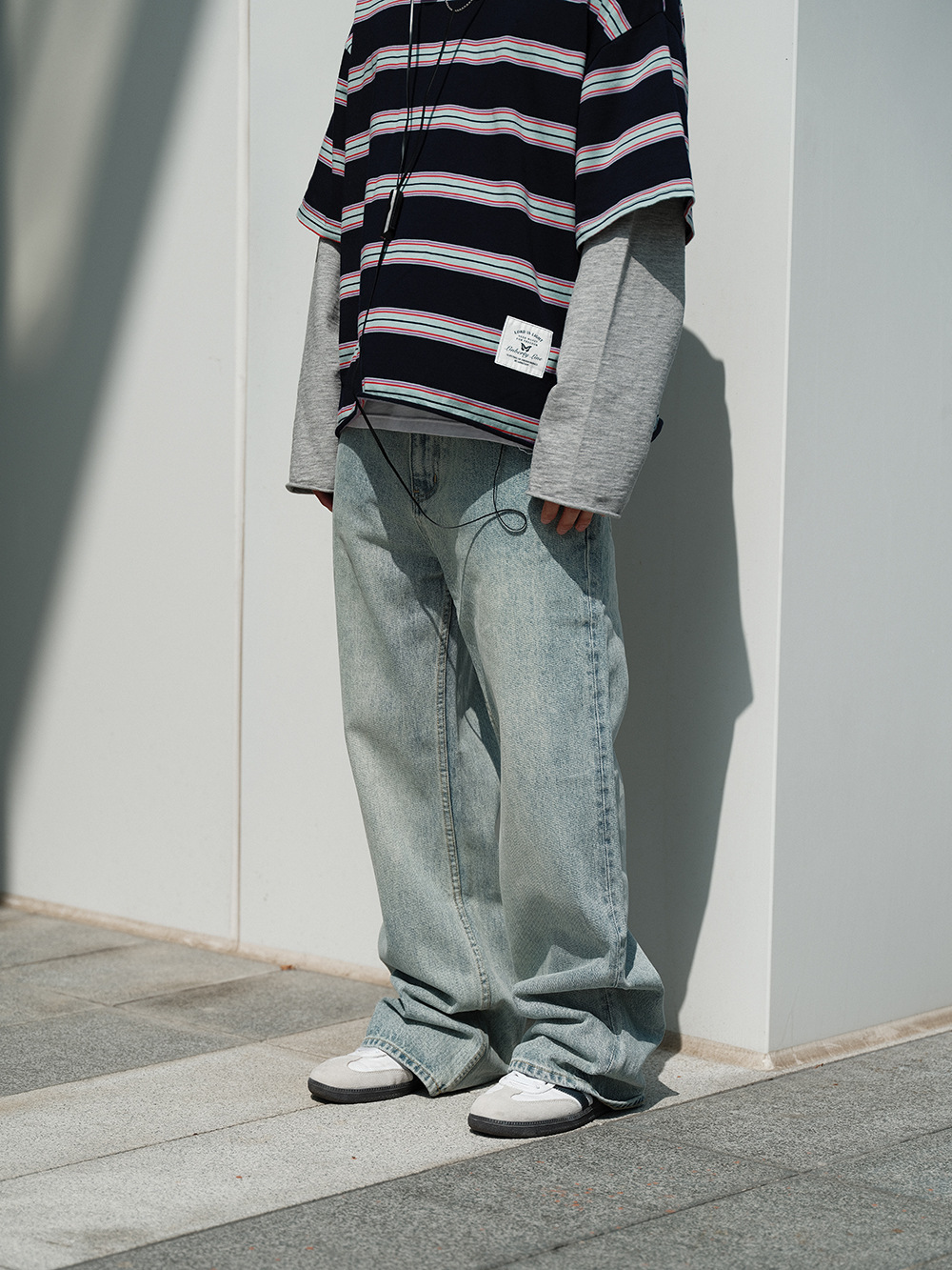 2024秋冬款,基礎百搭的牛仔長褲,面料已經過水洗預縮及脫色處理,質地柔軟非常舒適,這次在版型上做了加長微喇叭的寬鬆褲型,很適合在秋冬做日系風格的穿搭使用。