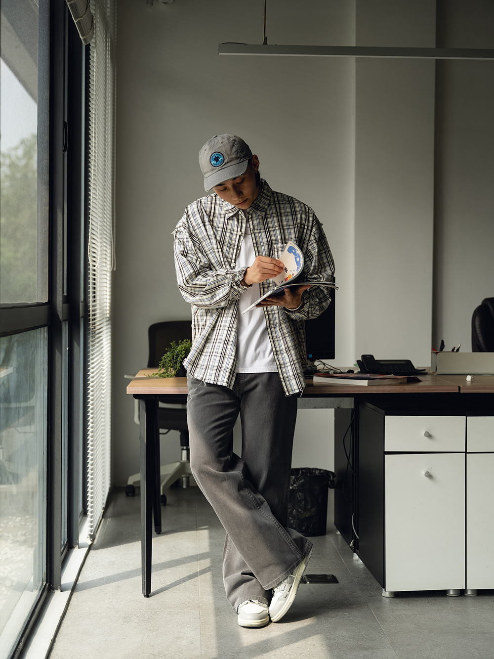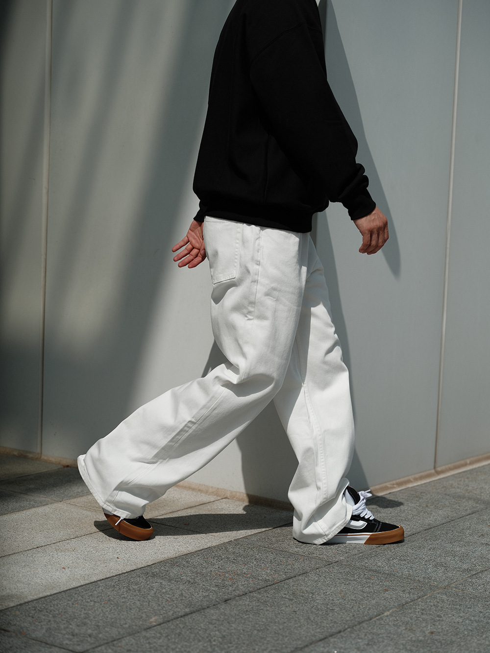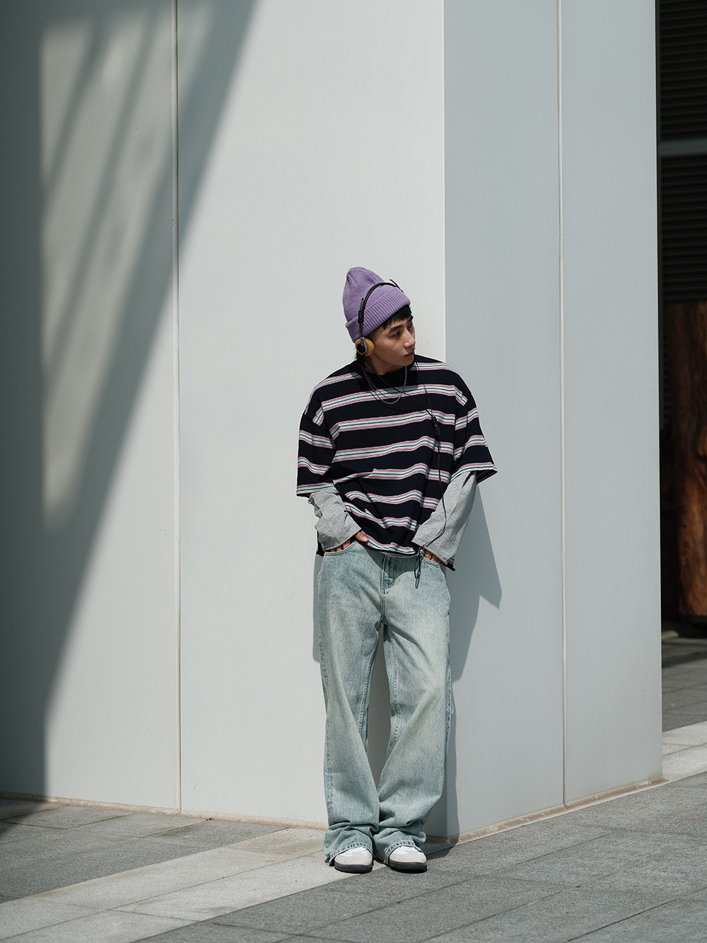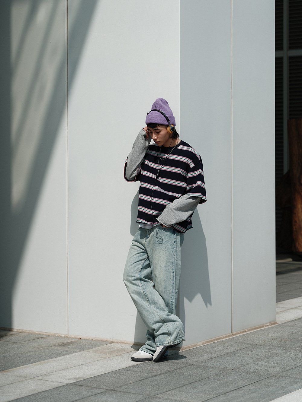 2024秋冬款,基礎百搭的牛仔長褲,面料已經過水洗預縮及脫色處理,質地柔軟非常舒適,這次在版型上做了加長微喇叭的寬鬆褲型,很適合在秋冬做日系風格的穿搭使用。