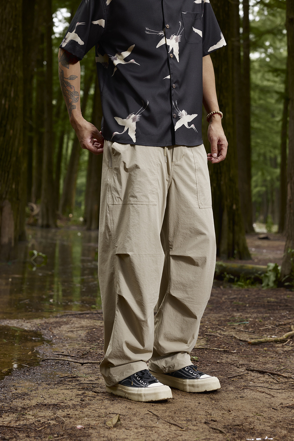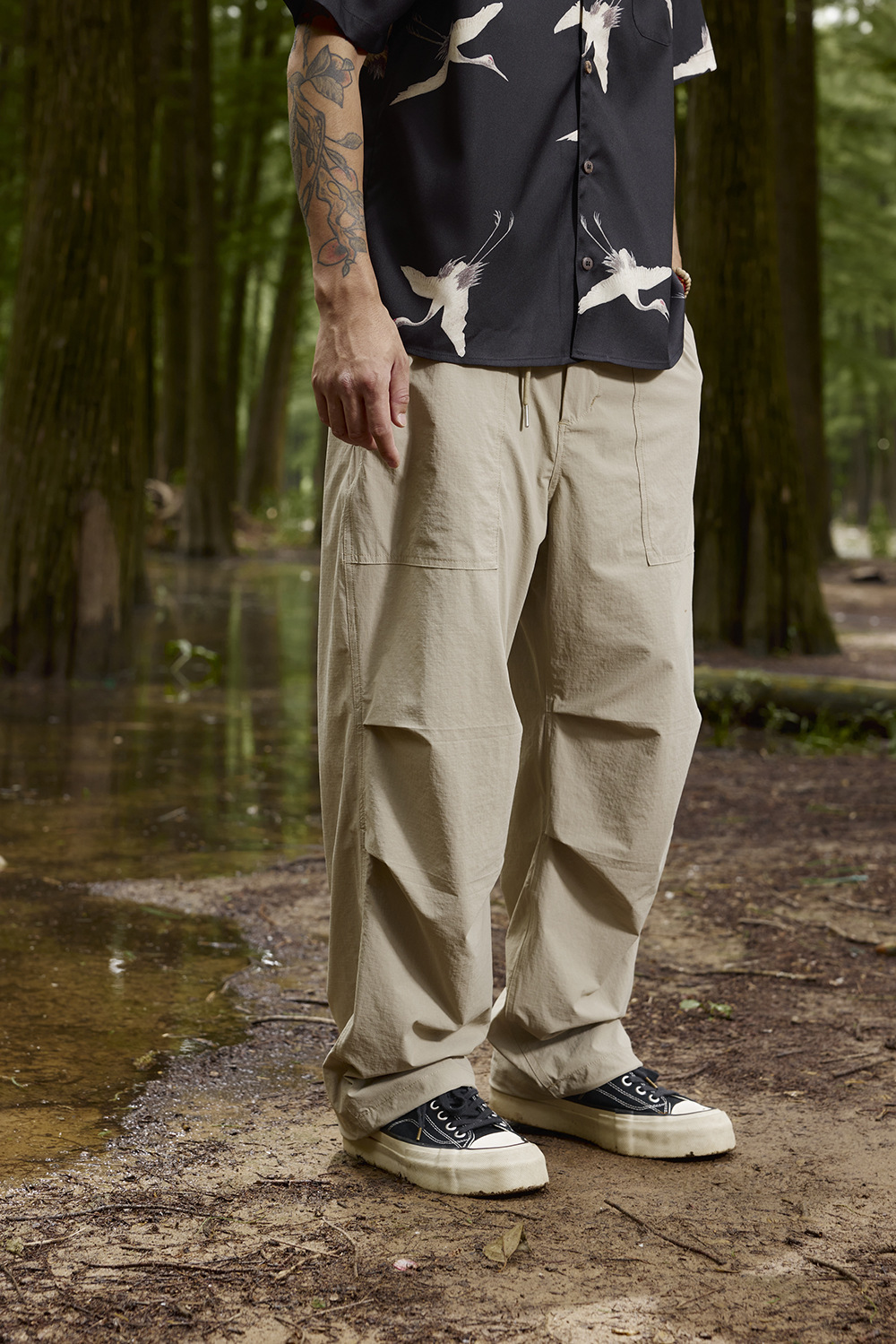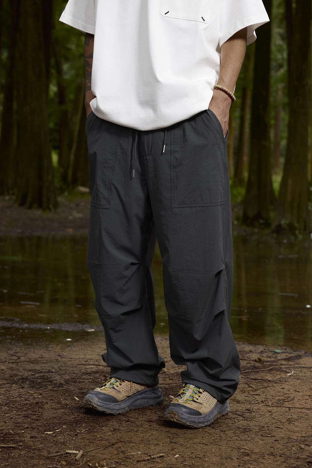 2025春夏款,此款採用輕薄涼感格紋面料,具有透氣速乾、輕柔觸感、彈性等特性,四季皆可穿著,直筒寬鬆版型搭配束腳抽繩設計,很適合休閒穿搭著用。