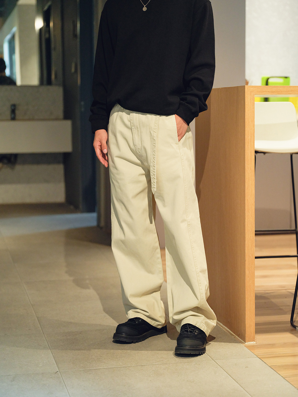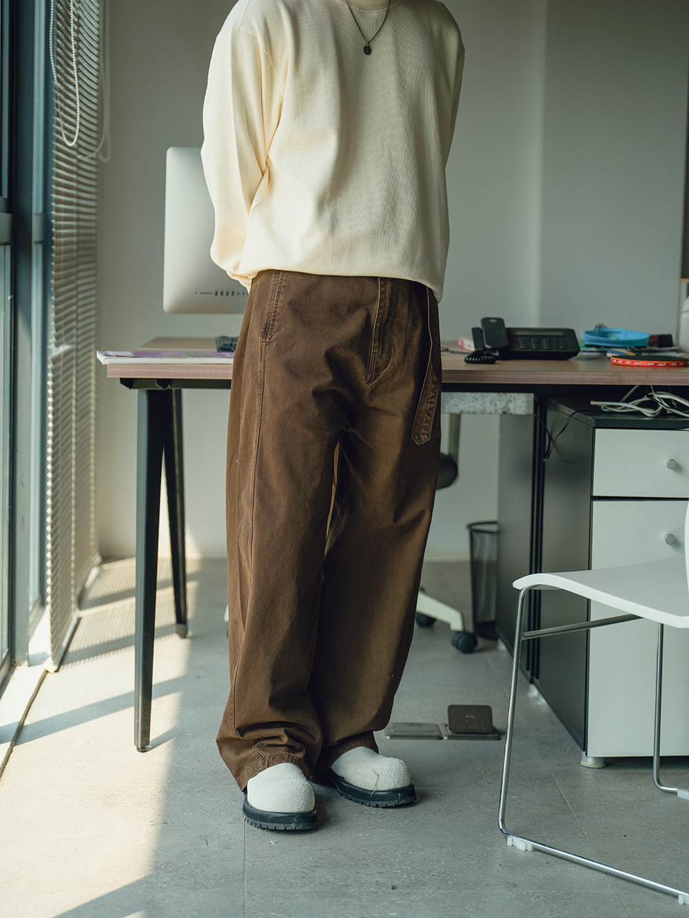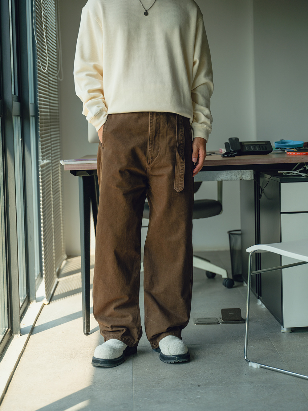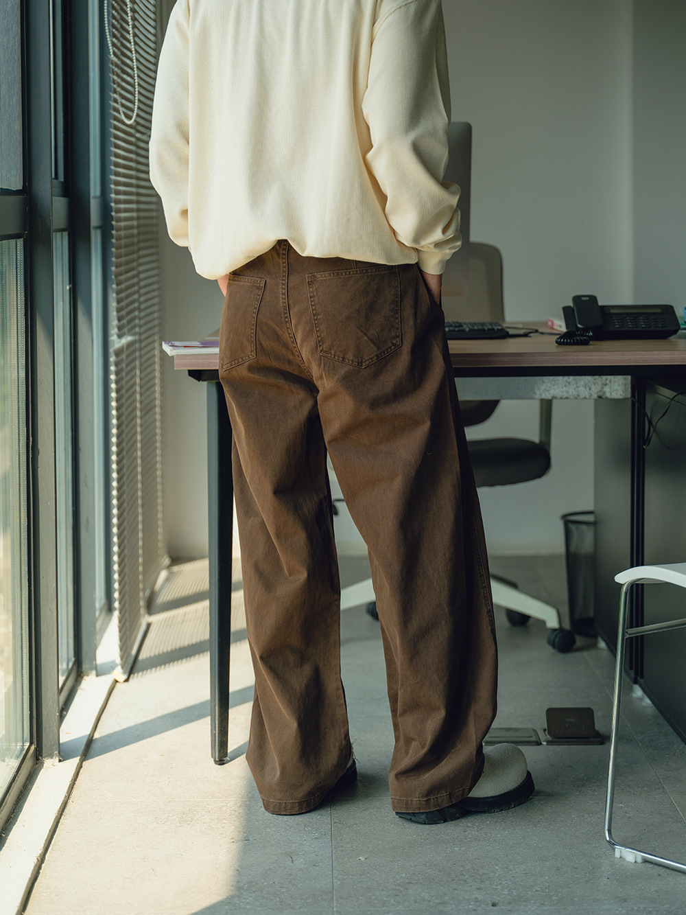 2025秋冬款,此款採用精梭純棉斜紋面料,精梭指一種經過精細處理的棉織物,僅保留細長且整齊的纖維進行織造,成衣水洗後為褲子控制縮水率,水洗後的質感及觸感都有更好的體驗,復古彎刀褲版型非常適合今年秋冬著用。