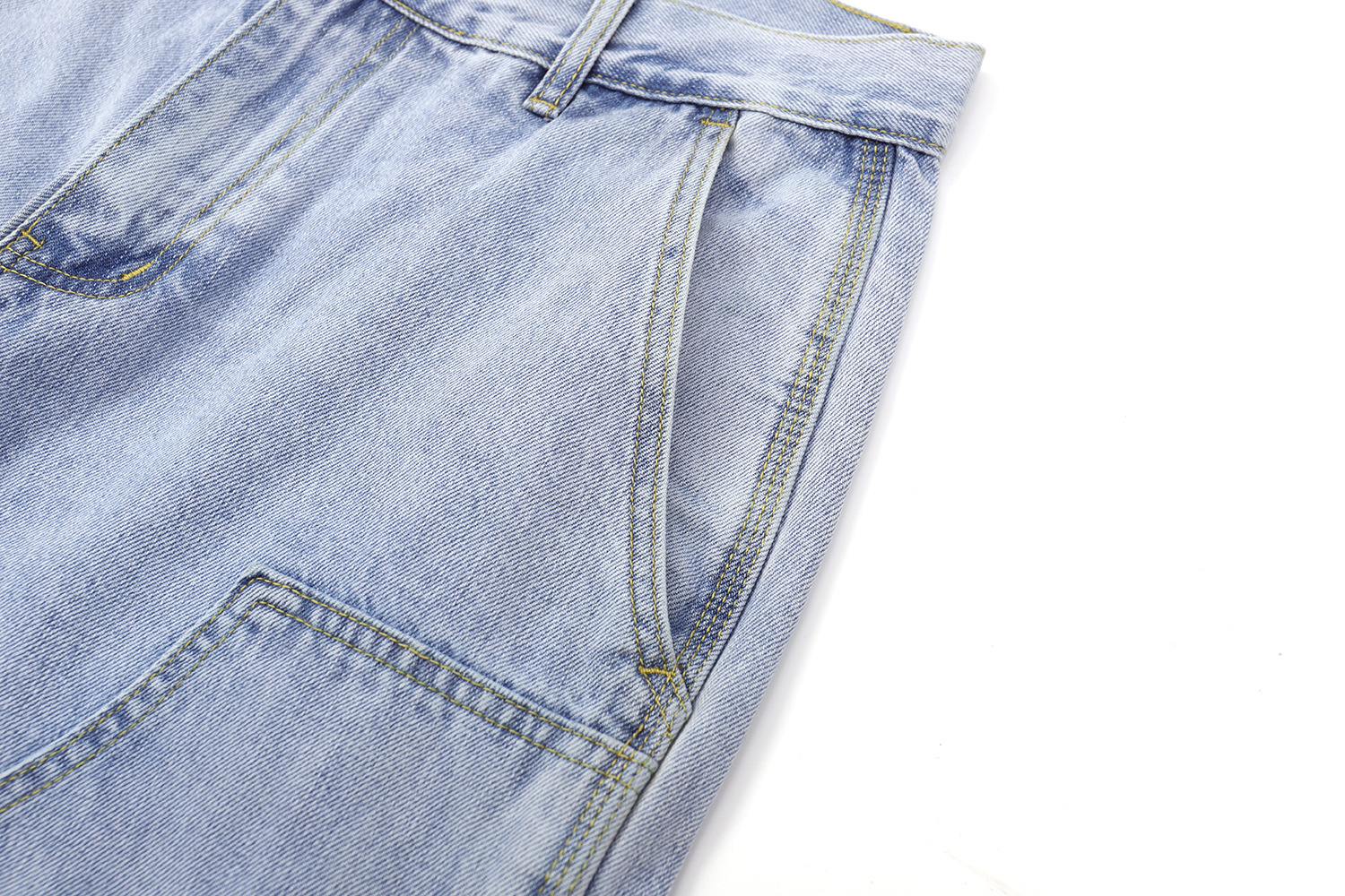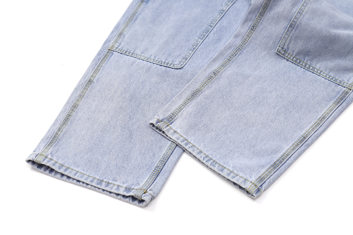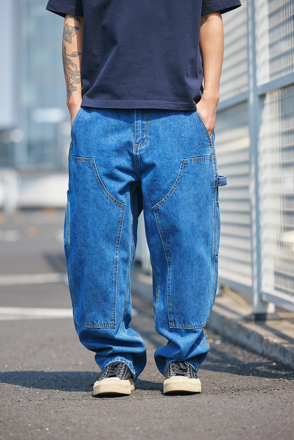 2026春夏款,12.OZ的竹節棉牛仔面料,紋理清晰、質地柔軟、纖維細長、耐磨耐穿。成品已經過水洗程序處理,完美的自然落色及柔軟易穿的手感,經典伐木褲造型搭配微錐褲型,隨便搭都好看!!