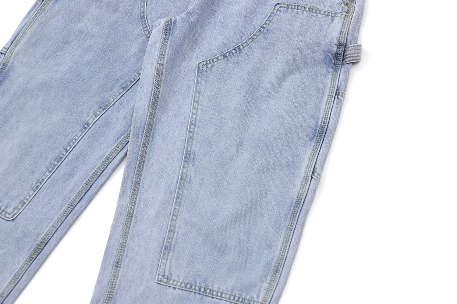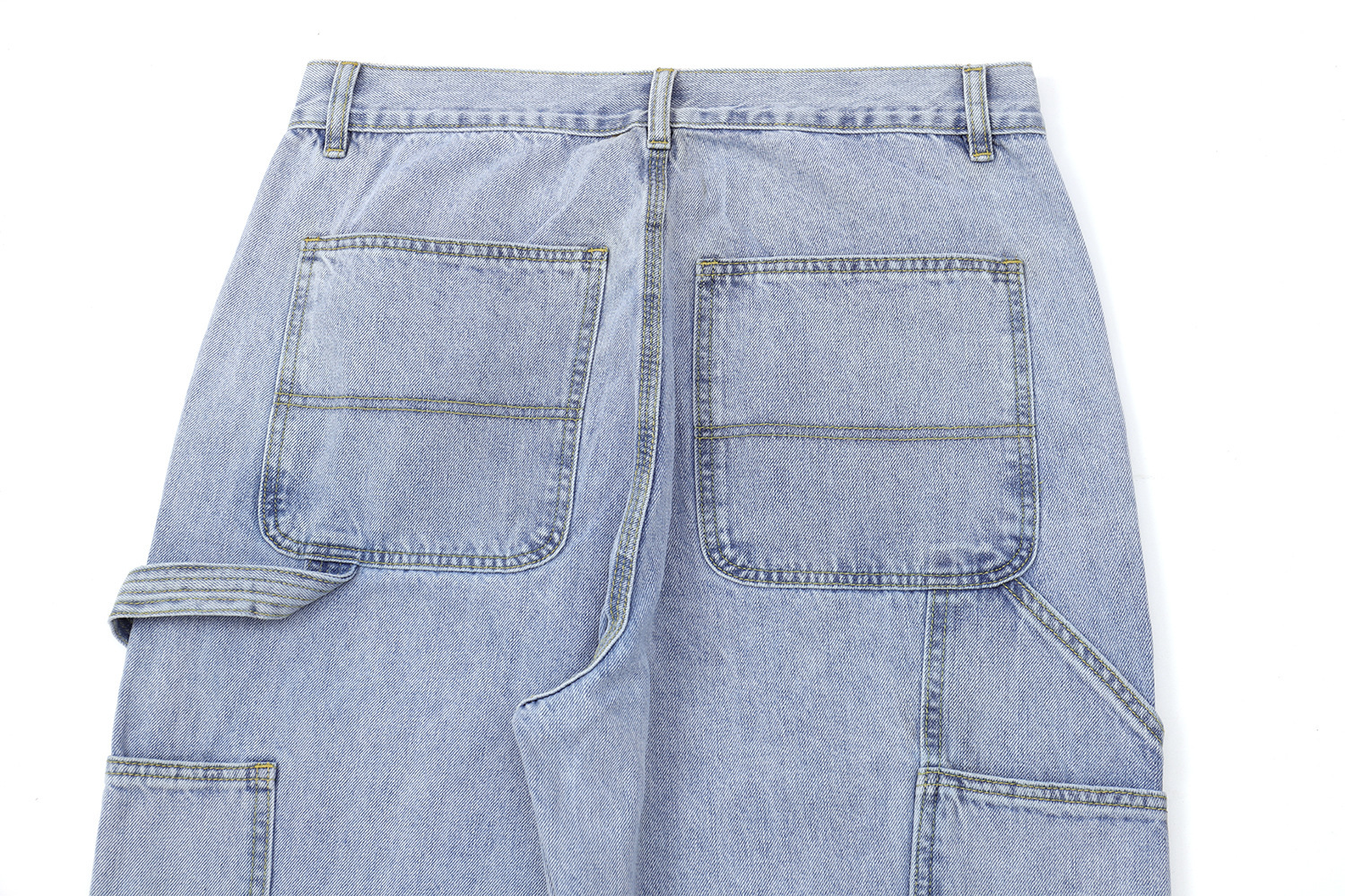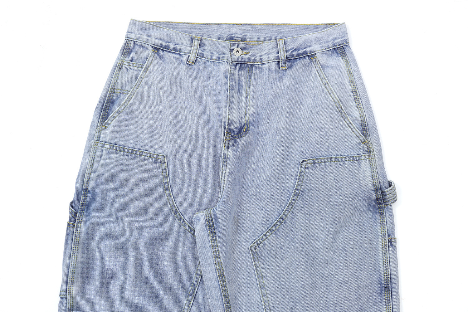 2026春夏款,12.OZ的竹節棉牛仔面料,紋理清晰、質地柔軟、纖維細長、耐磨耐穿。成品已經過水洗程序處理,完美的自然落色及柔軟易穿的手感,經典伐木褲造型搭配微錐褲型,隨便搭都好看!!